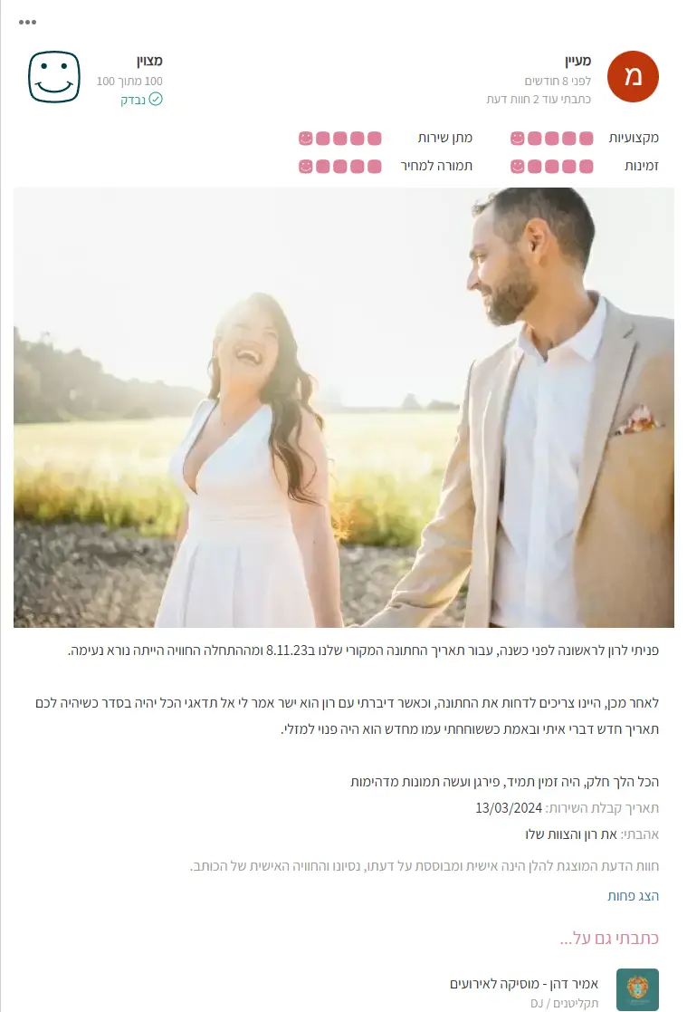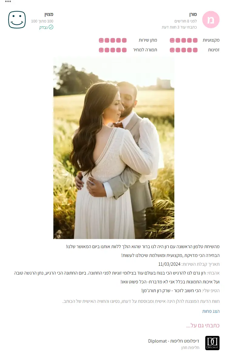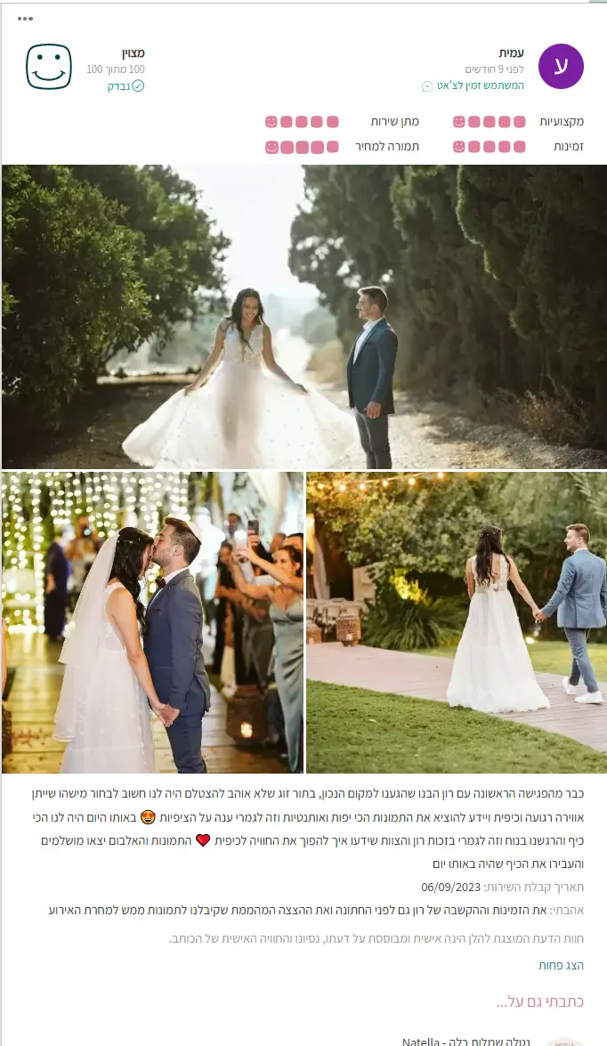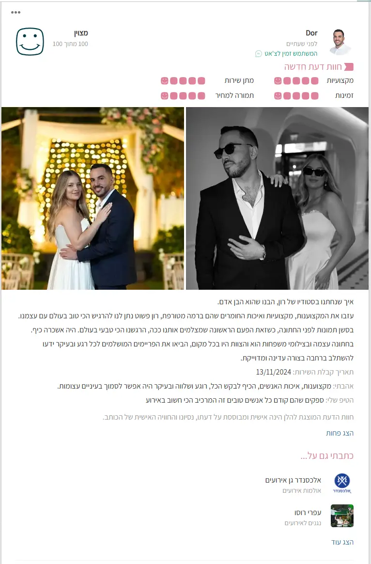ואוווו ואוו ושוב ואווו אין על רון באמת, כמה שהוא מוכשר ויחד עם זאת הכי נחמד שיש ונותן הרגשה כיפית בצילומים, פשוט זכינו שבחרנו בו ובצוות האלוף שלו, כמה מחמאות קיבלנו עליהם. רון נתן לנו תחושה כל כך נינוחה וגרם לתמונות להראות הכי אותנטיות ואמיתיות שיש וזה מה שהפך את התמונות בצילומי זוגיות למרגשות עד דמעות והתמונות באירוע עצמו מקרינות דרכן את האושר והשמחה שהקיפה אותנו ביום הזה! יחד עם זאת קיבלנו את התמונות תוך 3 ימים ואת הוידאו תוך חודש, הכל כל כך מקצועי ומושלם!! הבחירה ברון הייתה הבחירה הכי טובה שעשינו❤️