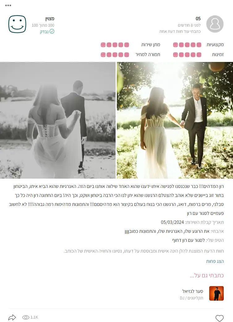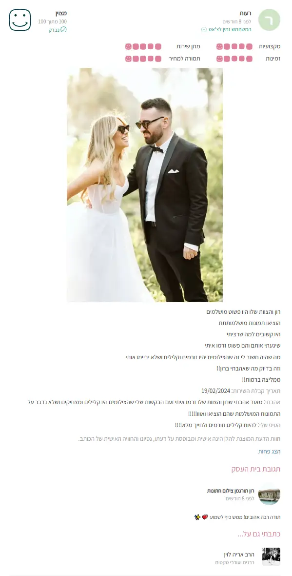 הבחירה ברון היא הדבר הכי טוב שתעשו לעצמכם ללא צל של ספק !!!! מהרגע הראשון הרגשתי הכי רגועה בעולם ! מעבר לזה שהוא צלם בחסד עליון ואדם כל כך מדהים ומקסים הוא ואלכס העניקו לנו את ההרגשה הכי ביתית וחמה שיש מהרגע שהם הגיעו הם הכניסו אווירה פשוט מהנה קלילה וכיפית ! בעלי שונא להצטלם והצילומים היו כל כך זורמים מצחיקים ומהנים שלא שמנו לב שהזמן עבר ! כל כך חששתי מהתמונות ופחדתי שהן יצאו לא לטעמי אבל כל תמונה יצאה יותר יפה מהשנייה !!קיבלנו כל כך הרבה מחמאות מכולם על איכות התמונות והסרטונים יצאו מושלמים באמת שהתוצאה הייתה מעל למה שיכולתי לדמיין לעצמי !!! ❤️ כל מי שרוצה להרגיש הכי רגועה יפייפיה מאושרת וקורהת ביום החתונה שלה ושזה ייצא ככה בתמונות רון הוא הכתובת ללא ספק !!! 😍