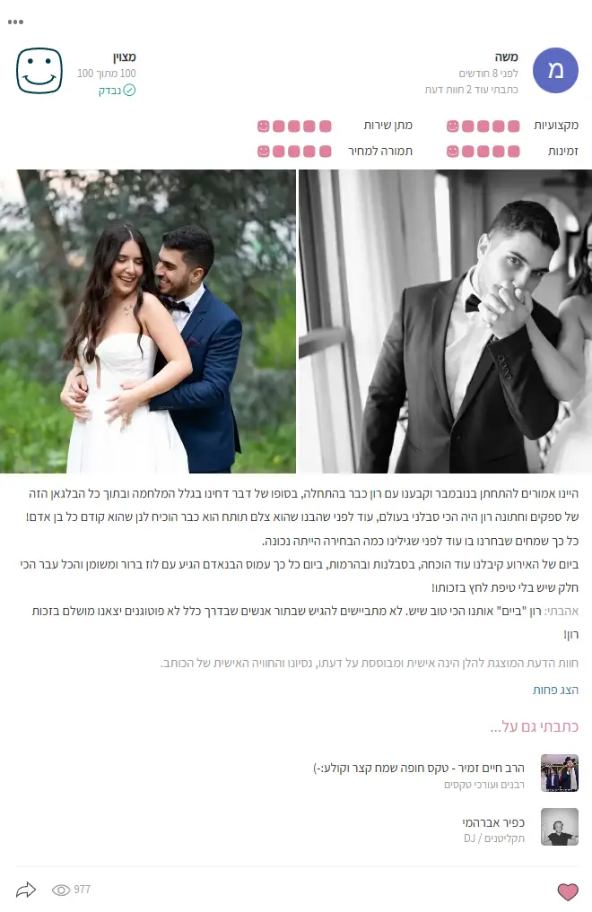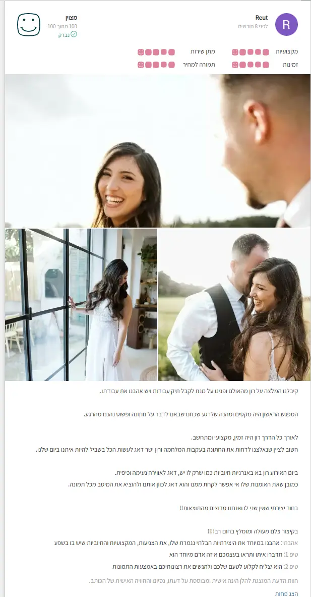על רון שמענו לגמרי במקרה וישר נכנסנו לראות את העבודות שלו, מאד בקלות אפשר להתרשם מהטבעיות שבה הוא מצלם, מהחיוכים, מהכיף והאווירה וגם מהעריכה הלא גסה של התמונות ולגמרי מחמיאה לכל אחד! מה שלא הועבר בתמונות הוא האדם שעומד מאחורי והכרנו את רון שבאנו לפגישה אצלו, פגישה כיפית, מזמינה, מצחיקה וישר נוצר חיבור בנינו ידענו שרון בטוח יצלם אצלנו אנחנו זוג שהיה לו חשוב הצילום וכל שאלה שפשוט עלתה לראשי\ בקשה הכי קטנה רון ישר נענה אליה, הכניס ללוז, קבע לשבת ונתן את היחס הכי חם שיש! נהנו אתו מכל רגע, הוא נתן לנו את התחושה שאנחנו הכי יפים ומיוחדים ושמרנו על אווירה מרימה כל היום עם כל המלווים הודות לרון שנתן גם להם המון המון מקום גם הצלם וידיאו והסטילס ה2 שבאו אתו היו פשוט נעימים וטובים!