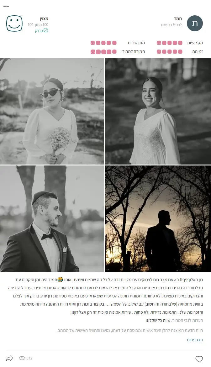 מקצועי, צנוע, נעים, מצלם תמונות מדהימות מכל זווית אפשרית, מלווה את הזוג לכל אורך הדרך.