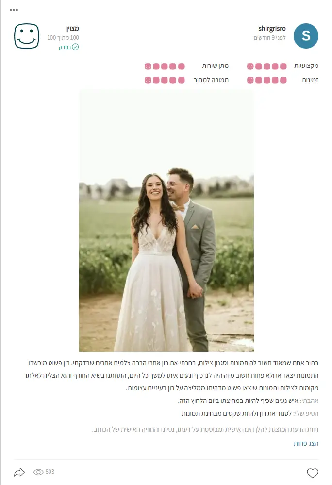 "צלם מקצועי, נעים ואדיב. התמונות, האלבום והסרטון היו מושלמים. נהננו להצטלם עם רון. ממליצה בחום!!"
